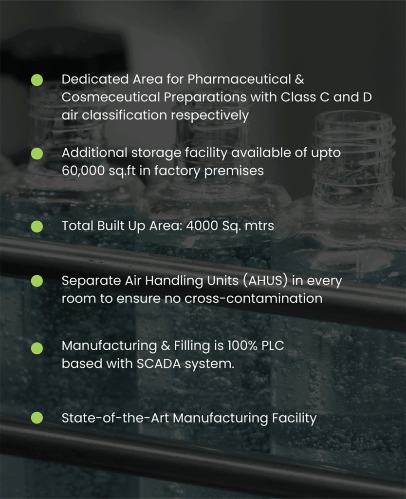 - Manufacturing Capacity 100kgs (Scale up) to 2000 Kg Cosmeceutical Section.
